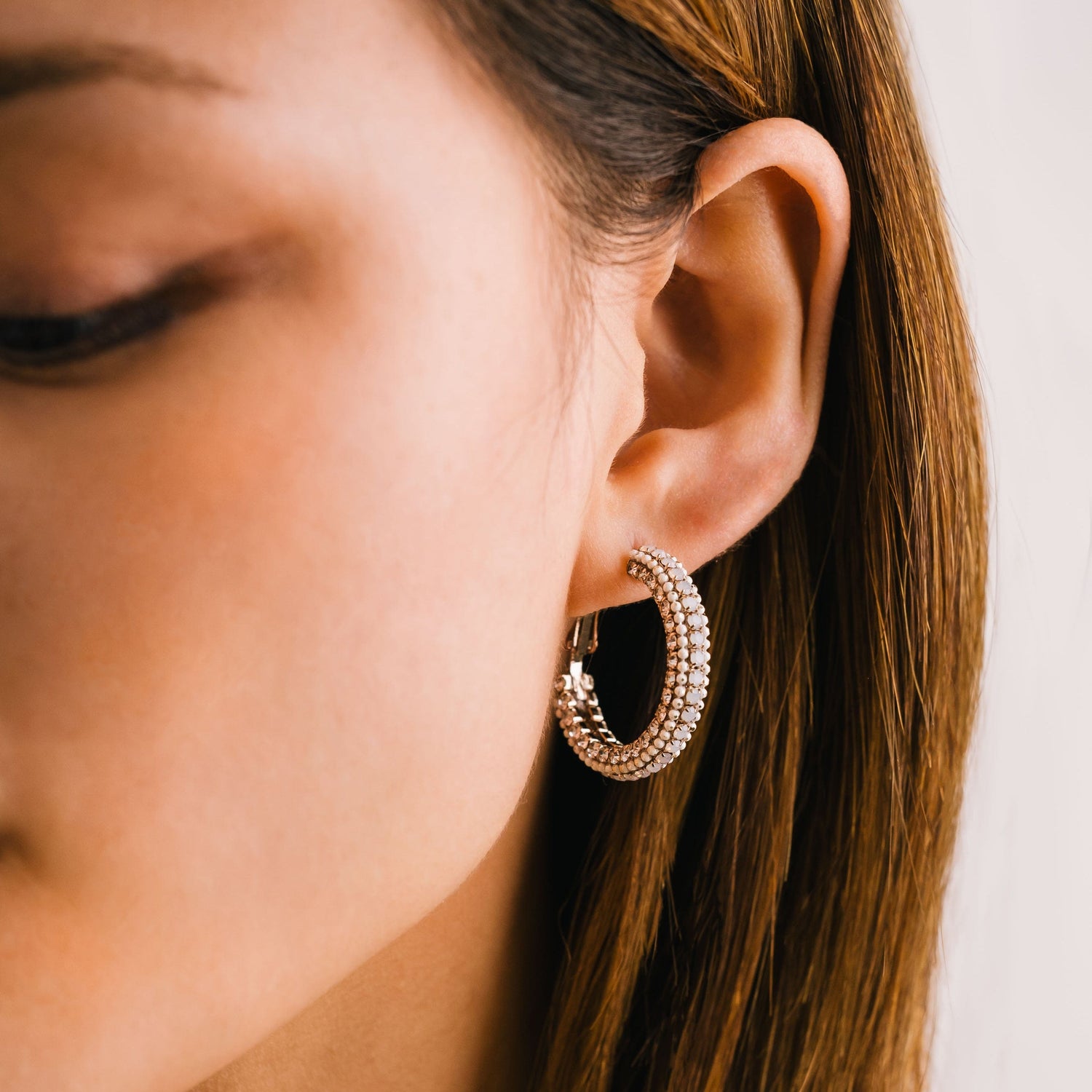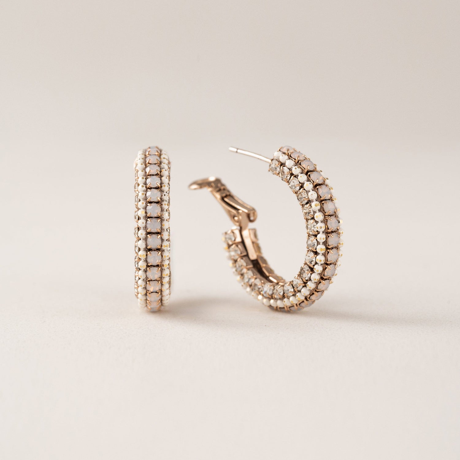 A modern take on 1920s glamour. These arresting hoops are adorned with glimmering crystals and intricate beading for a truly show-stopping look.