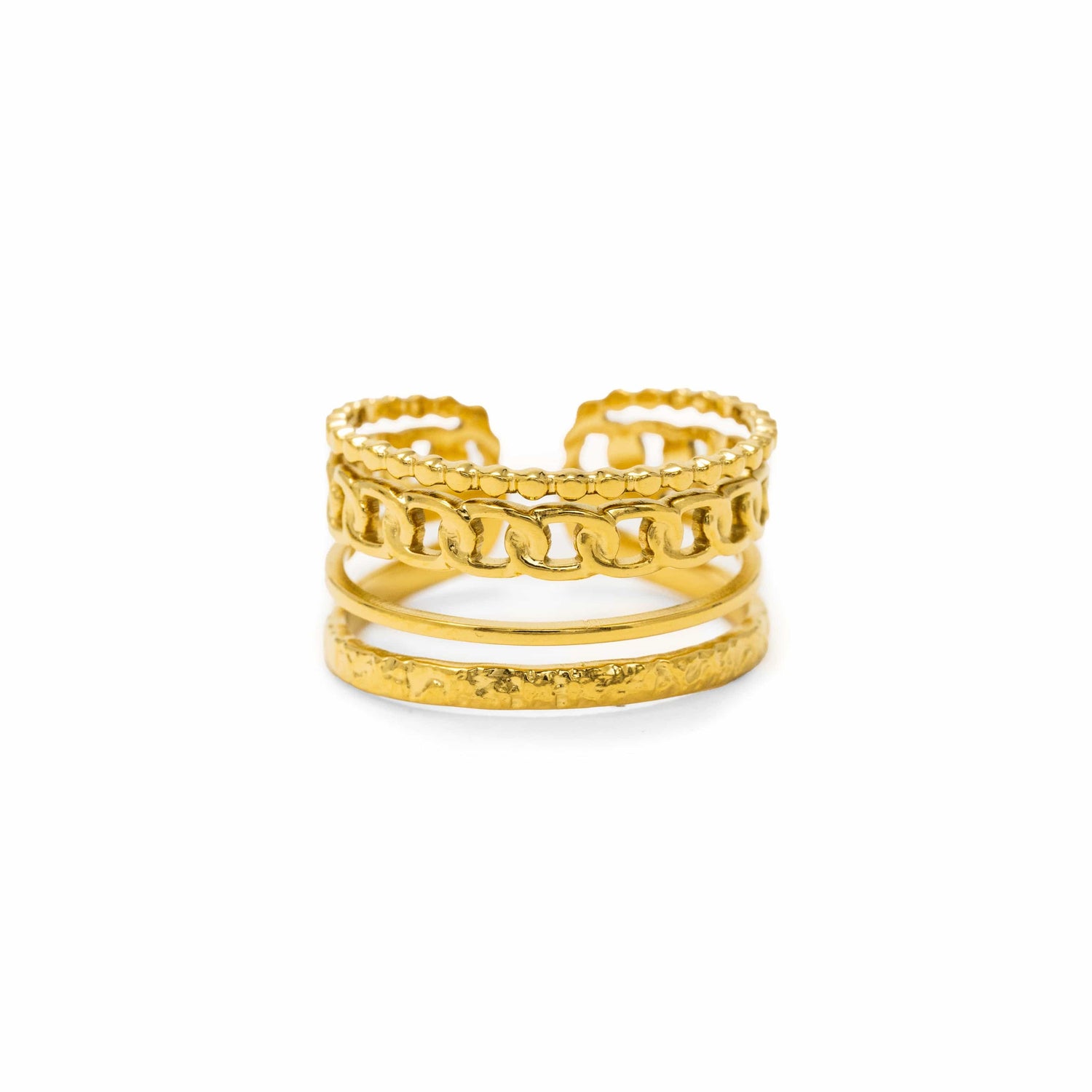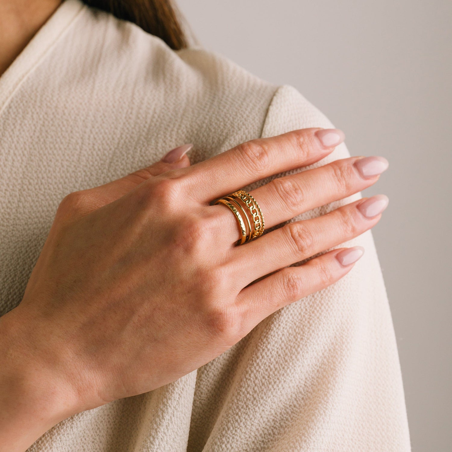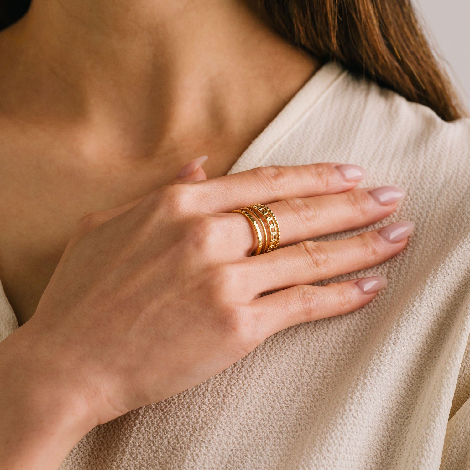 A ring with multi-faceted shape and texture that’ll captivate from all angles. Made with PVD and stainless steel, you can wear this waterproof ring anywhere.