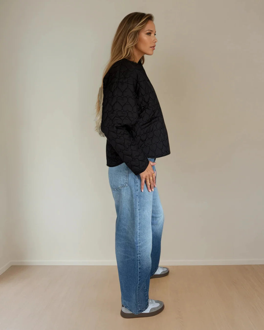 Stay cozy and cute in the Bree Hearts Quilted Coat Black. This lightweight coat features charming heart embroidery that adds a playful touch to your look while keeping you warm without the bulk. Perfect for layering on cool days, its stylish quilted design blends comfort with fashionable flair.