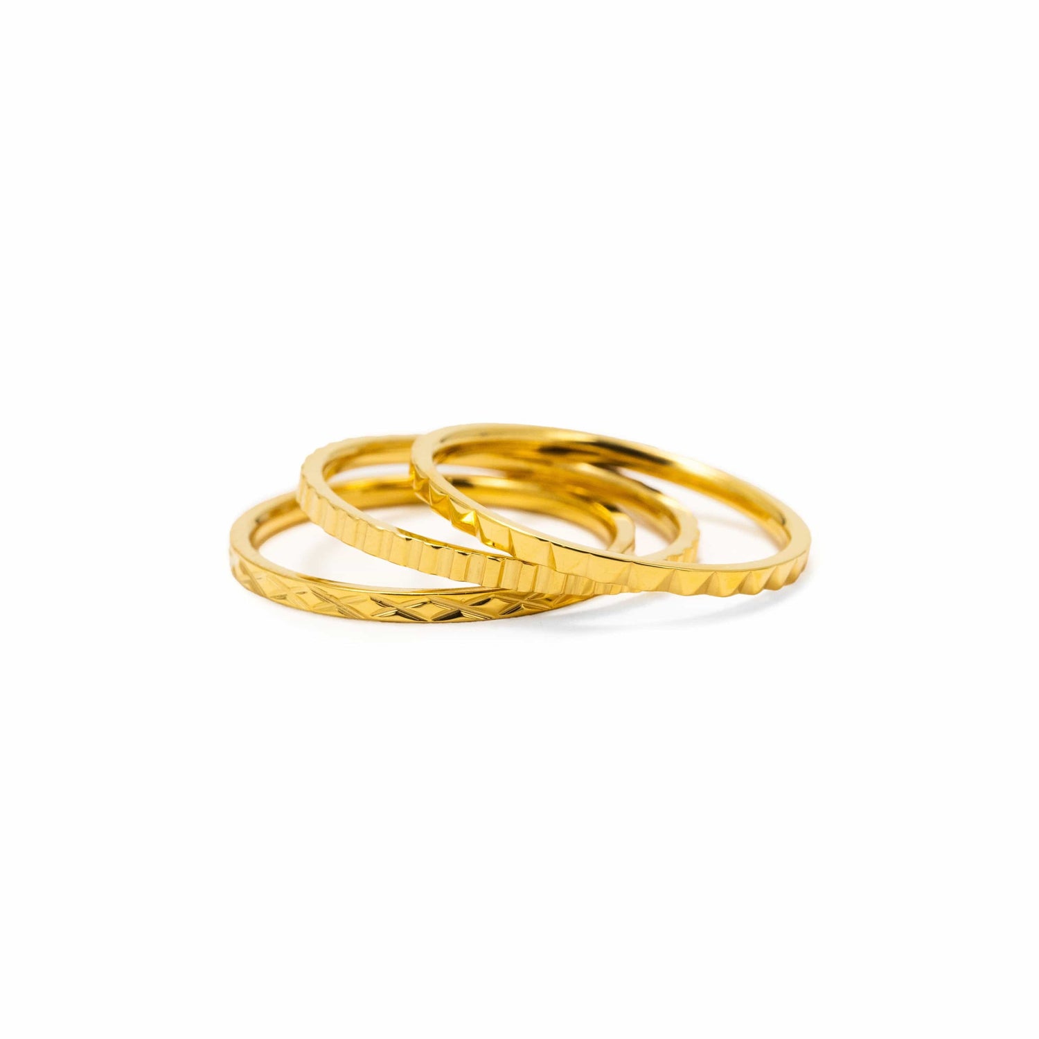 A set of light-catching textured rings to elevate your ring stack. Made with PVD and stainless steel, you can wear these waterproof rings anywhere.