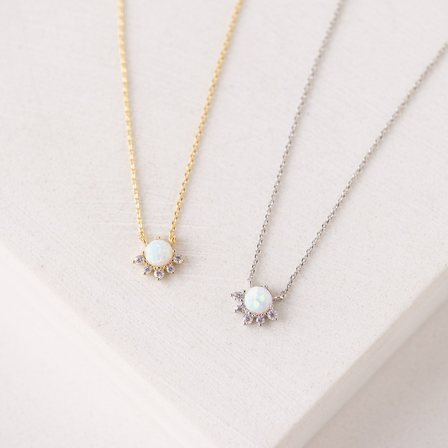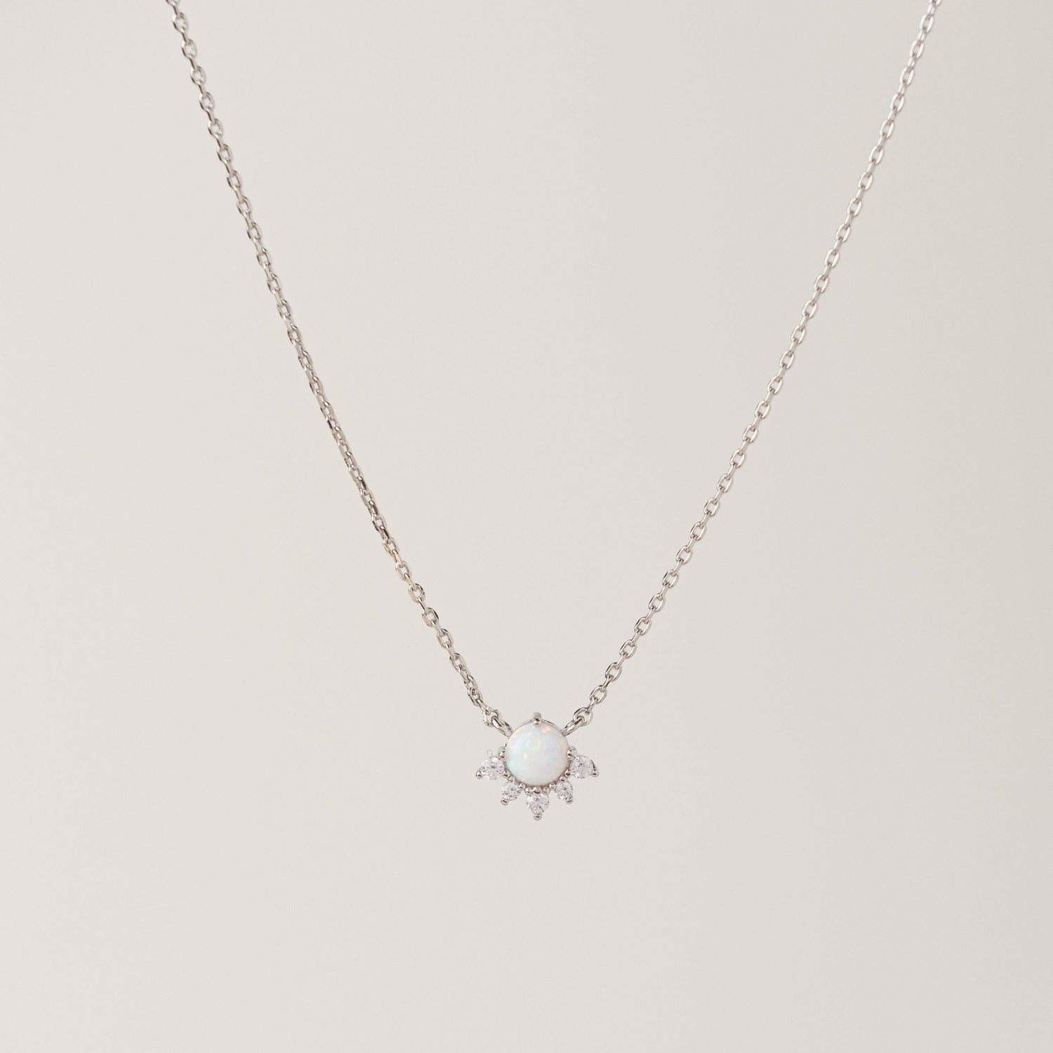 A vibrant and luminous opal stone with a crown of cubic zirconia crystals swings from the perfect chain to add a little decadence to your everyday.