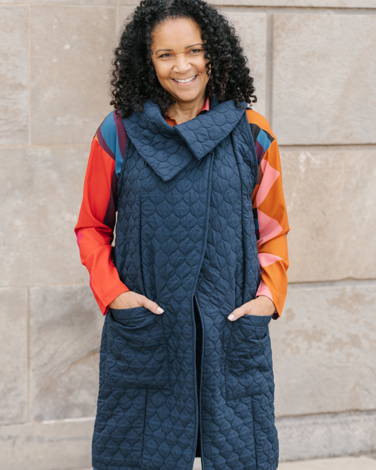 Turn heads and steal the spotlight with the Meredith Vest – a masterpiece of modern chic and cozy comfort! Featuring a bold, oversized collar and a standout button beneath its asymmetrical neckline, this sleeveless sensation is a style game-changer. With spacious patch pockets for practicality and longer hemline, it’s the ultimate in easy layering. Crafted from cozy quilted fabric, the Meredith Vest adds a touch of sophistication to any outfit.