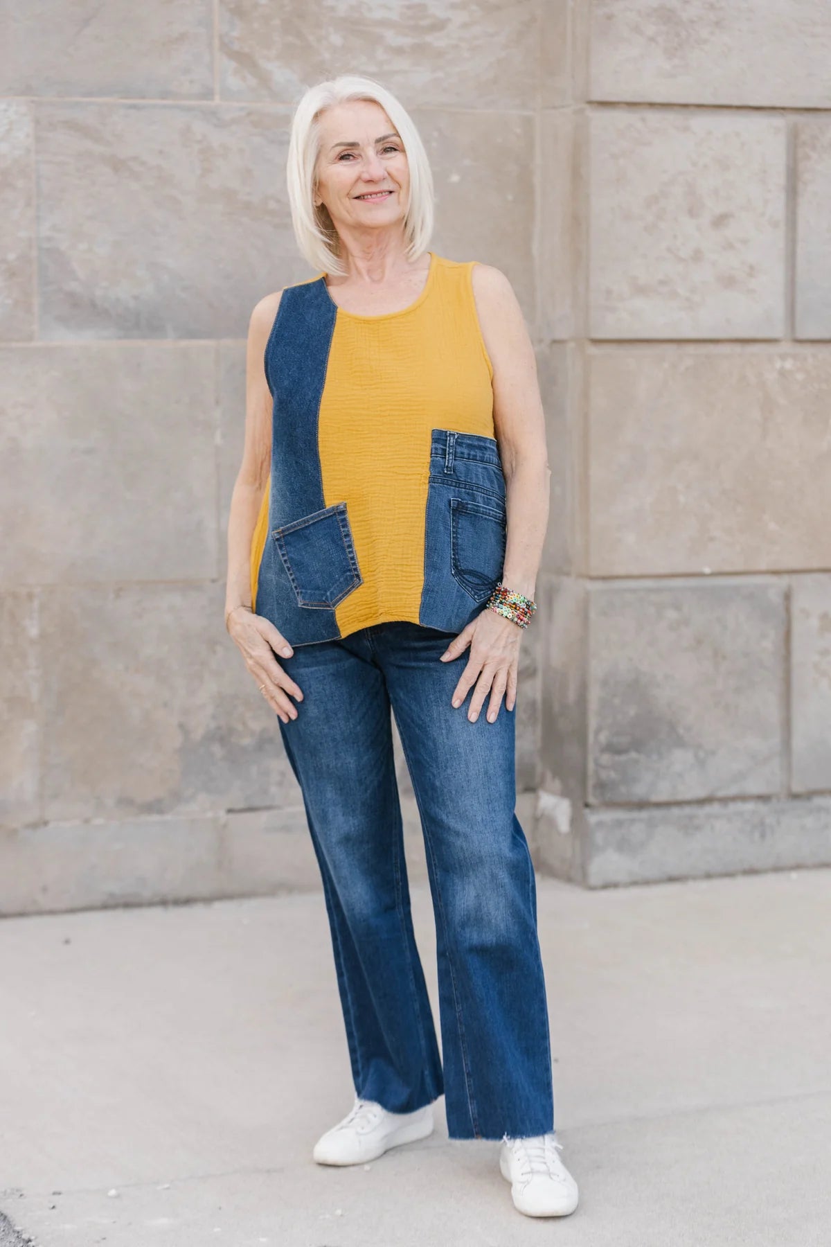 loosely-woven texture with a slight vertical stretch. We focus on having minimal environmental impact by carefully selecting materials like this Cotton Gauze, as it is a wonderful long-lasting material and local to our artisan maker’s region. We upcycled the vintage denim and designed combining deconstructed vintage denim pieces which diverts it from the landfills and gives it new life.