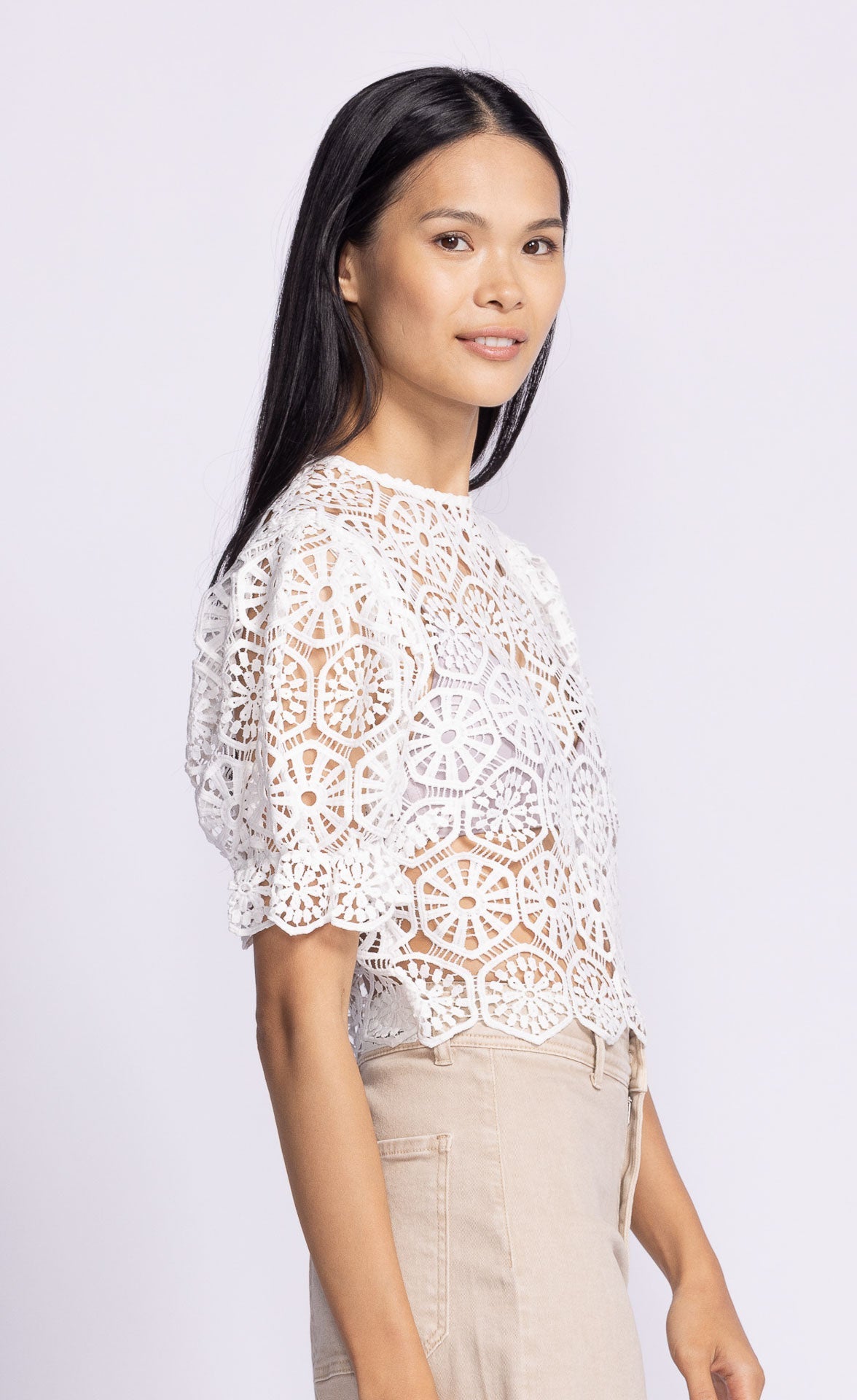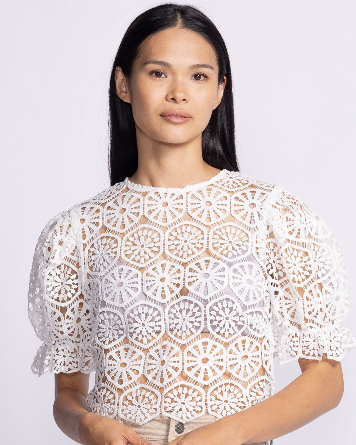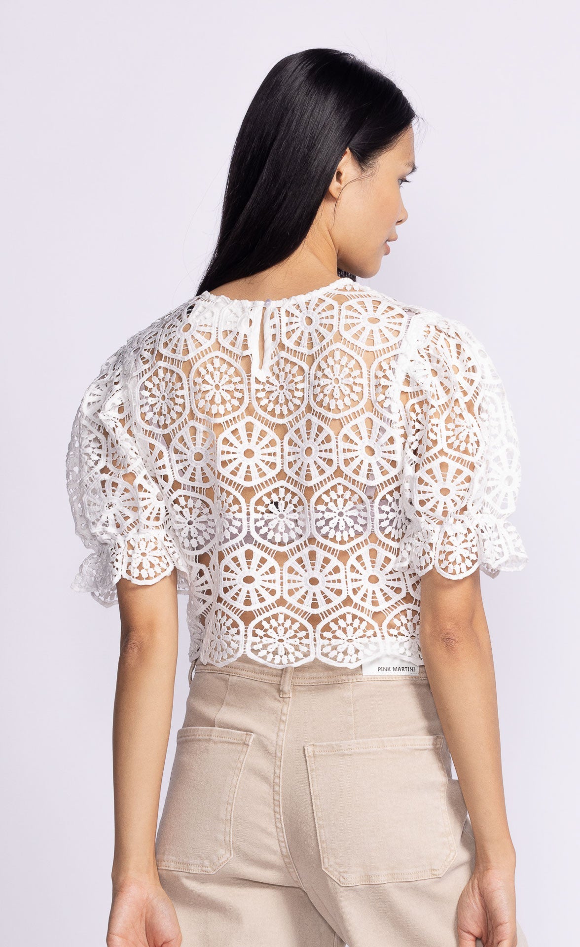The Petra Top is a dreamy, semi-cropped lace top with delicate puff sleeves—perfect for warm days or stylish layering. Light, airy, and effortlessly chic!