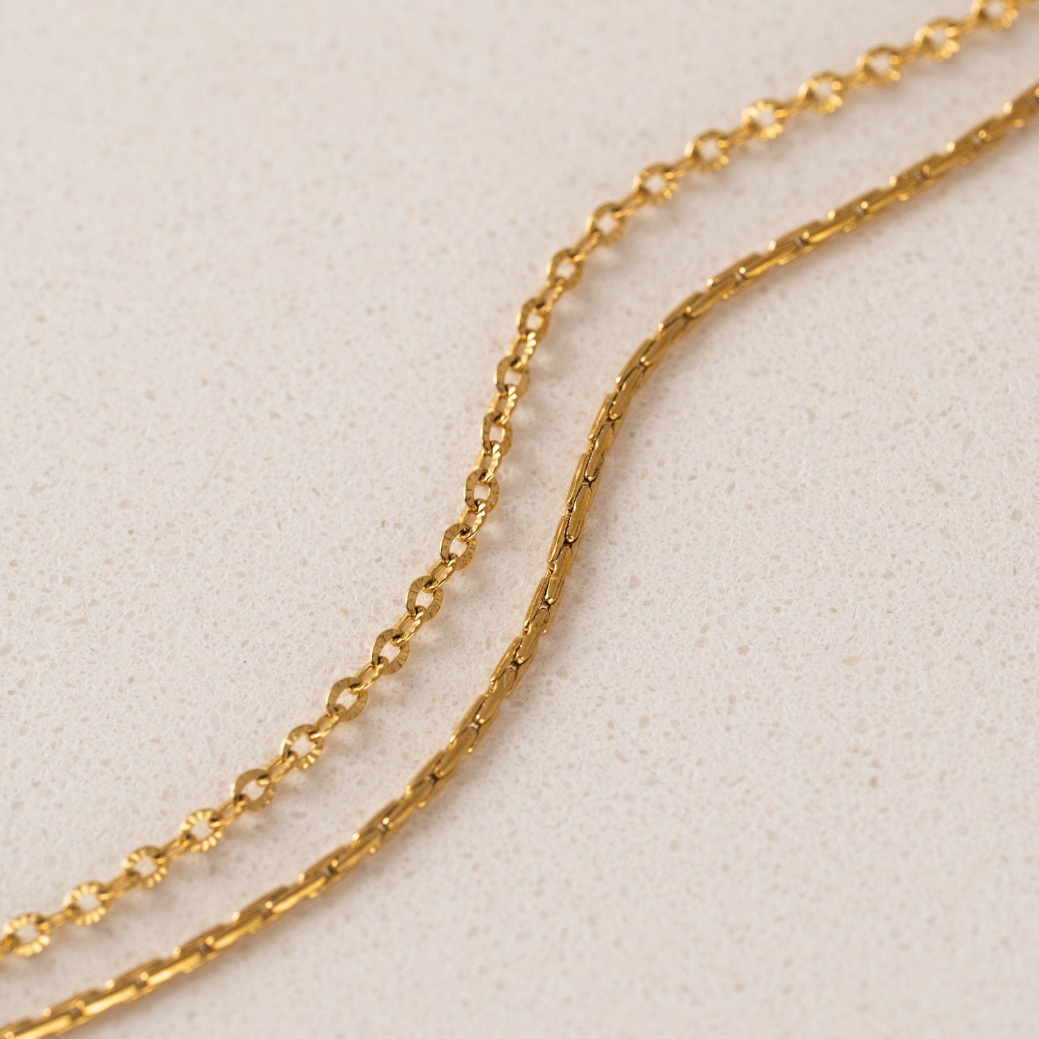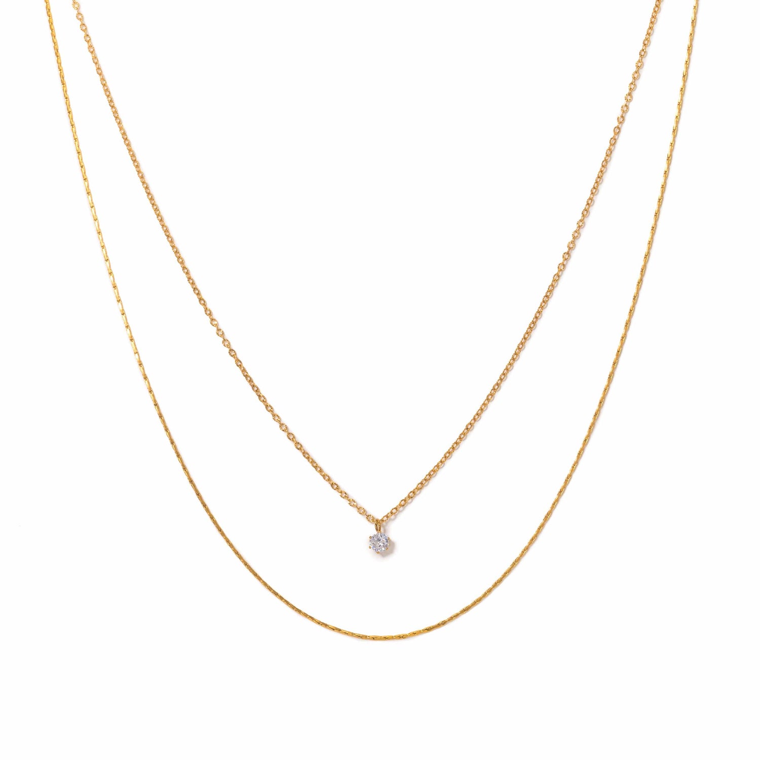 Elegant enough for everyday wear, but with a touch of luxe. This delicate layered chain necklace features a single cubic zirconia pendant, adding just the right amount of sparkle to any outfit. Brilliant cubic zirconias set in sleek stainless steel & 18K Gold-PVD.