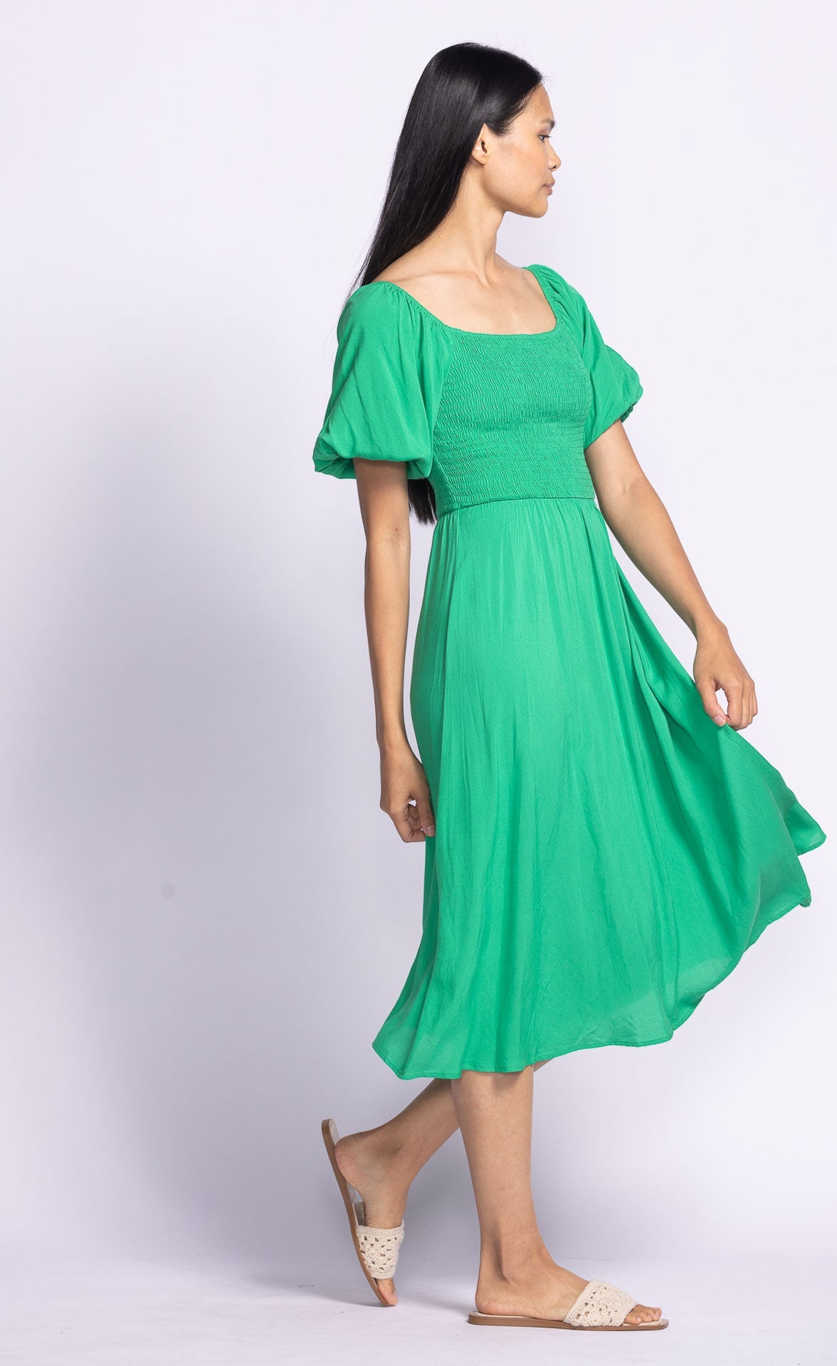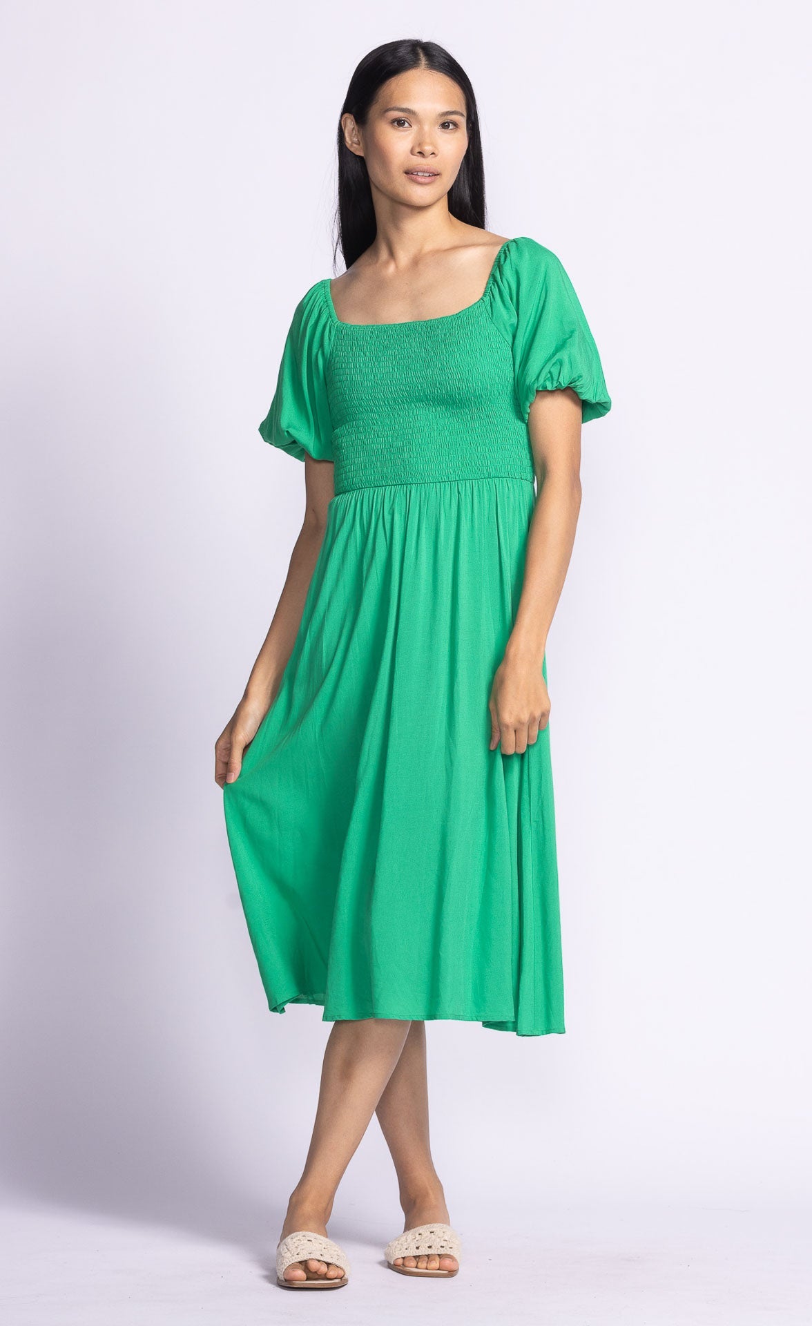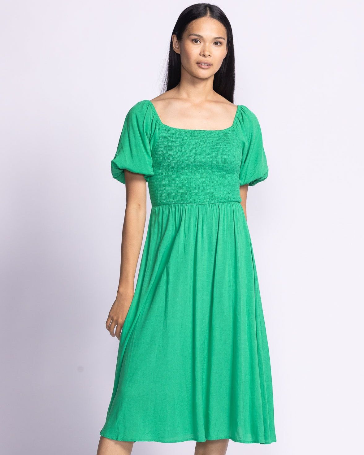 The Stassi Dress showcases puffed sleeves and an elastic bodice for a flattering stretch-to-fit silhouette, complemented by a beautifully flowy skirt for a graceful look.