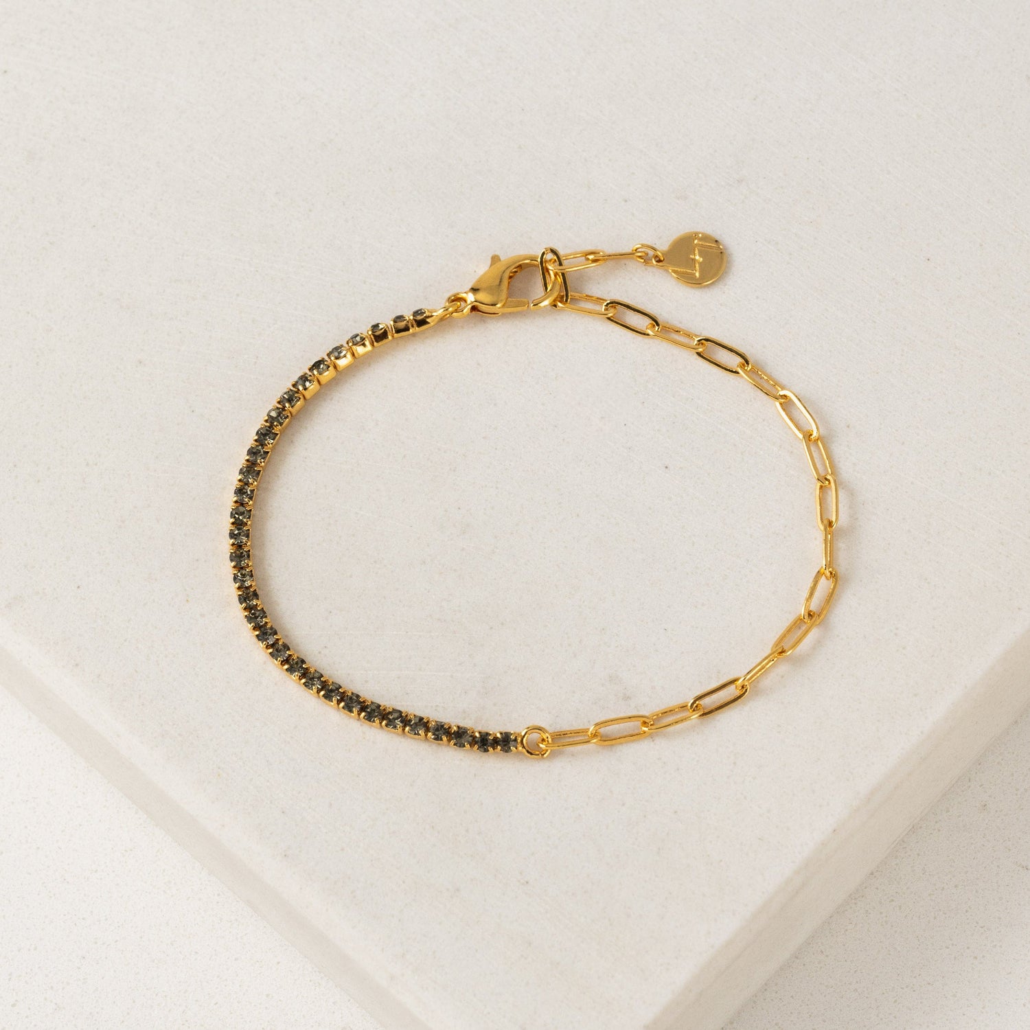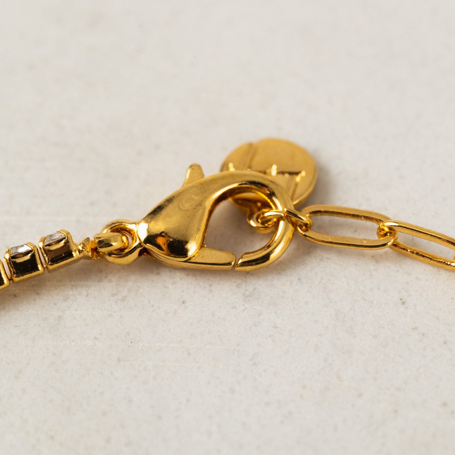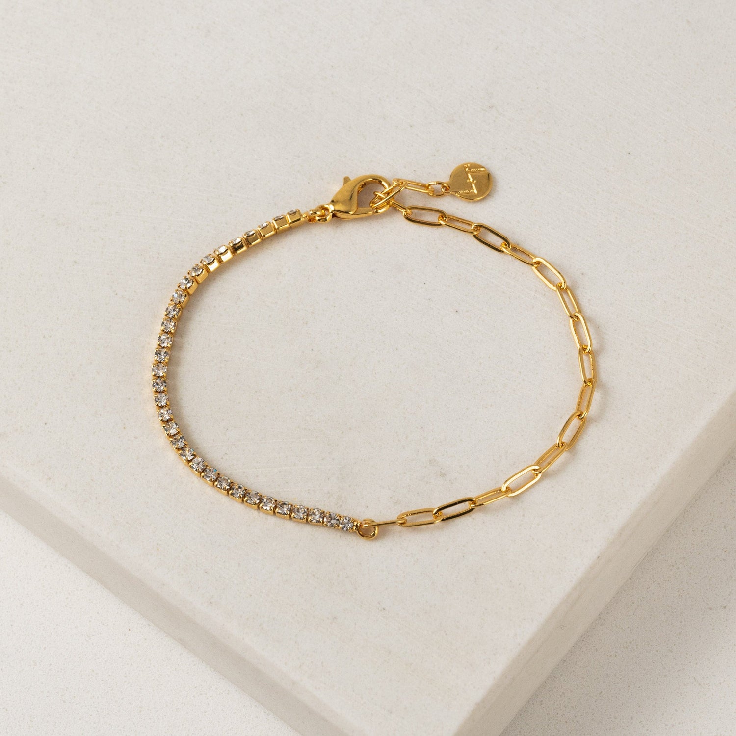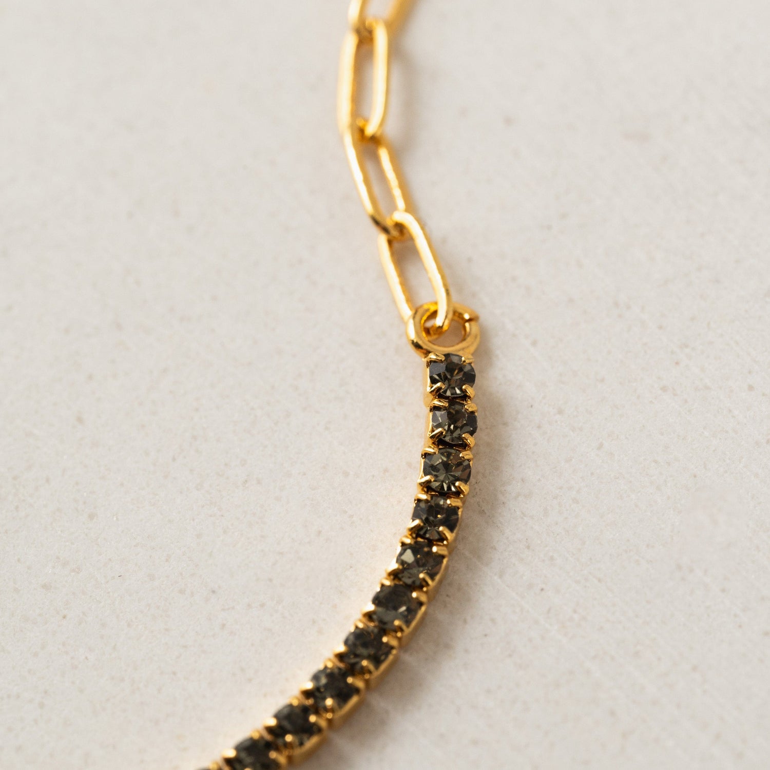 A fresh take on the classic tennis bracelet. Paperclip and glass crystal chains merge to create an exquisite statement piece.
