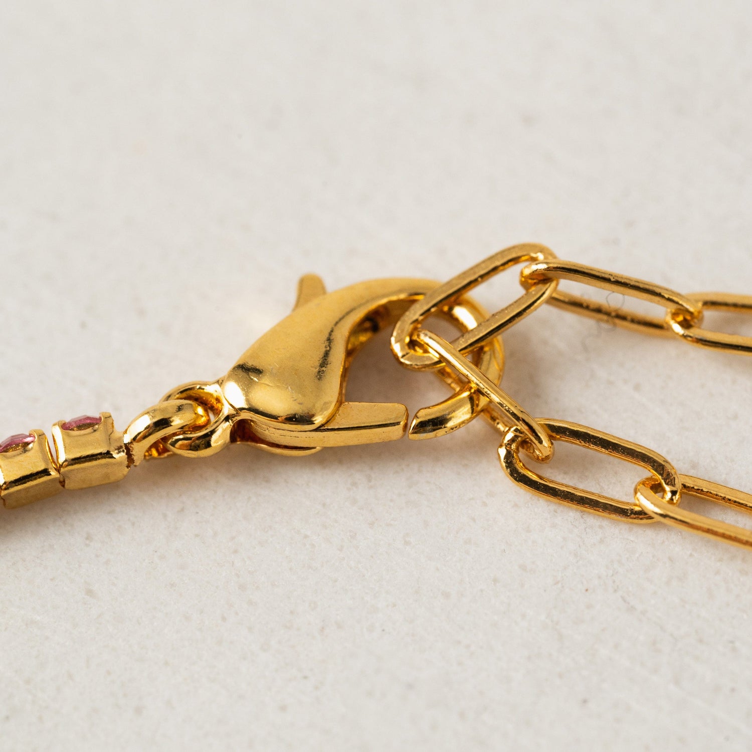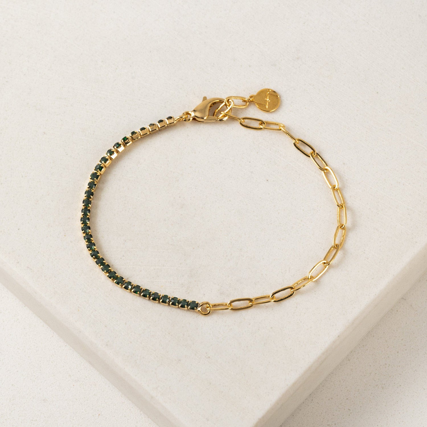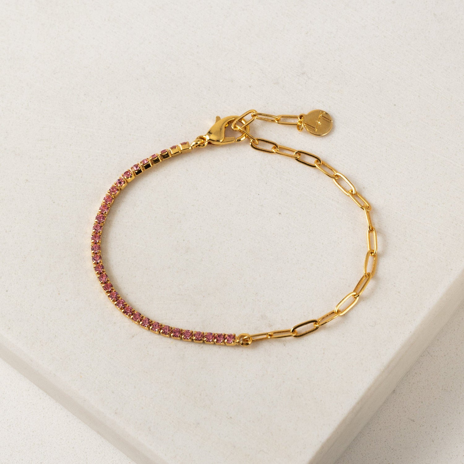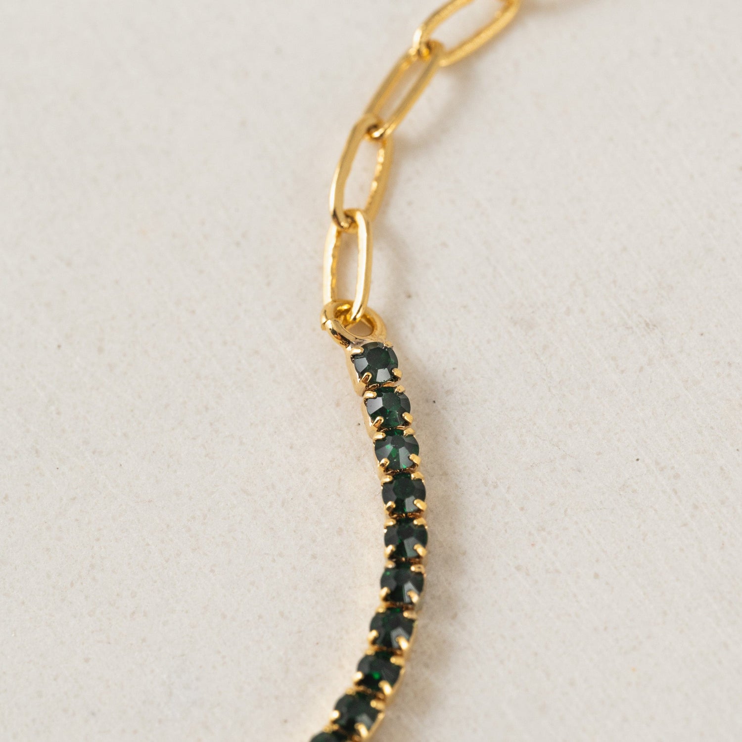 A fresh take on the classic tennis bracelet. Paperclip and glass crystal chains merge to create an exquisite statement piece.
