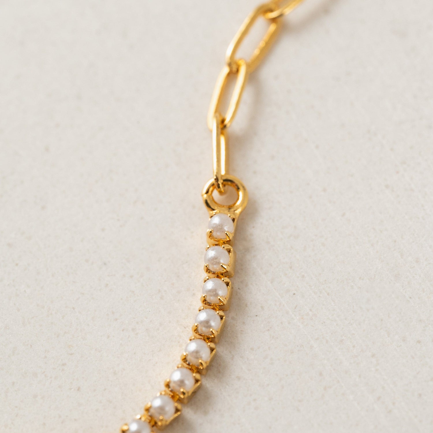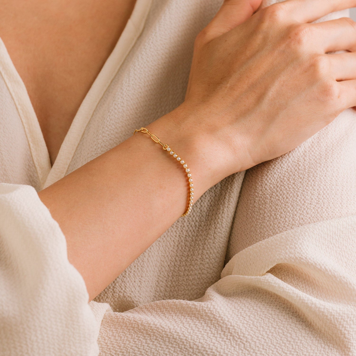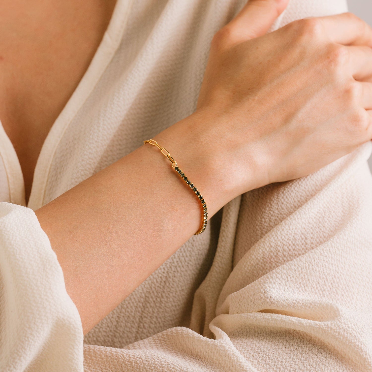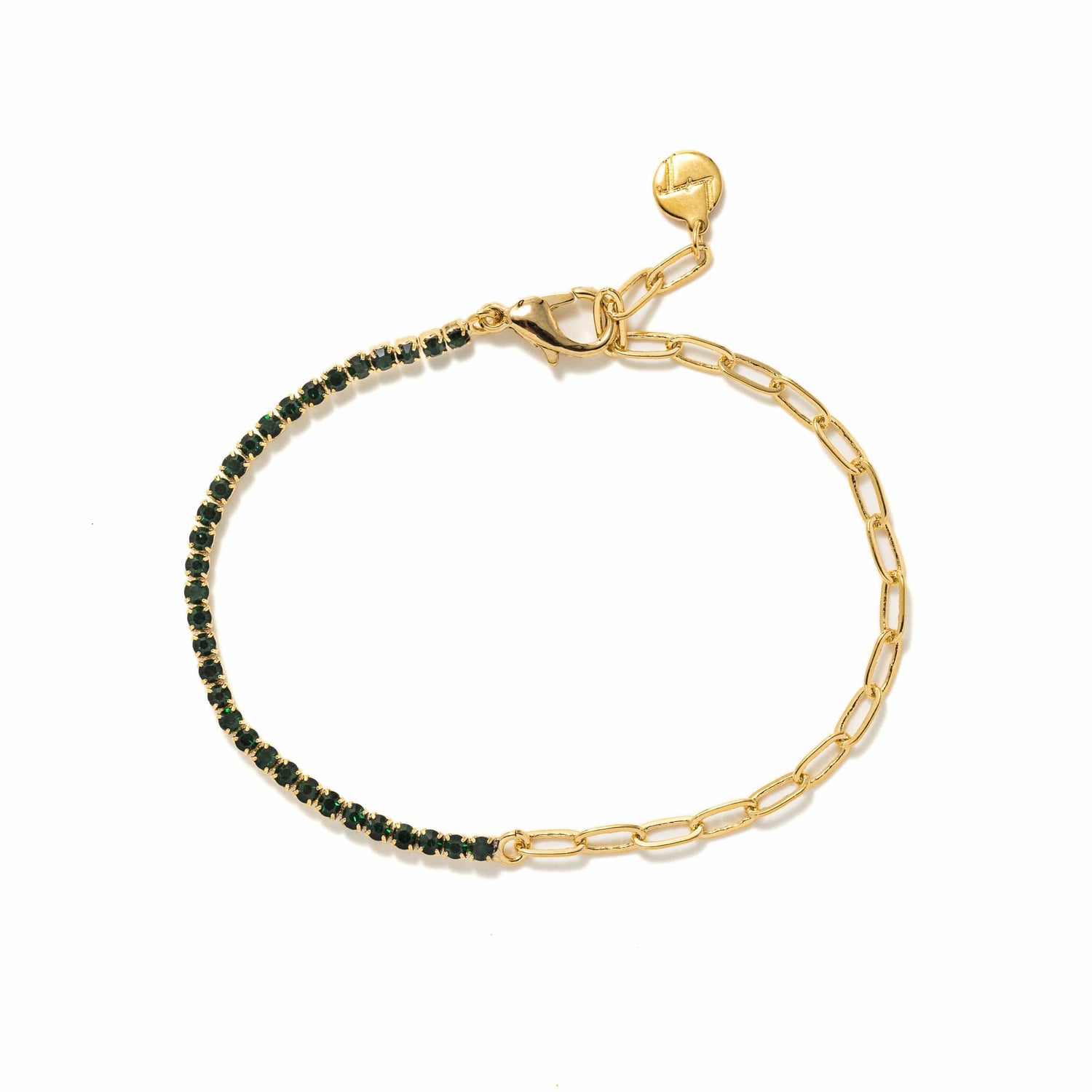 A fresh take on the classic tennis bracelet. Paperclip and glass crystal chains merge to create an exquisite statement piece.