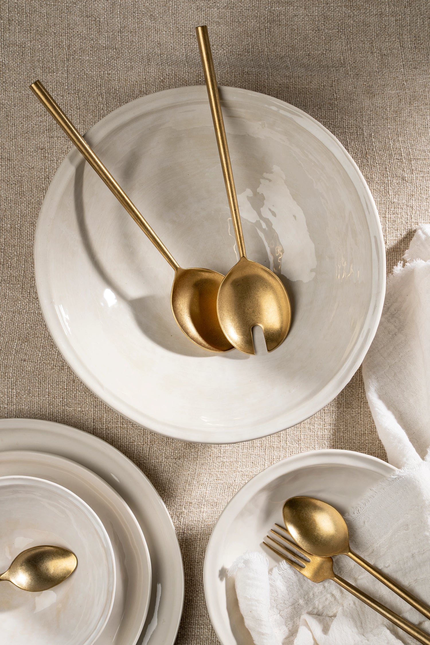 Hand forged in Moradabad, a city in India known for metal craftsmanship, our Tides Salad Servers are a testament to timeless quality. Hand-forged from stainless steel, these servers boast a distinctive distressed matte gold finish that proudly bears the authentic marks of their skilled makers. Elevate the presentation of family style pastas and salads with their enduring elegance. Each box includes two 11" serving spoons. Hand wash recommended.